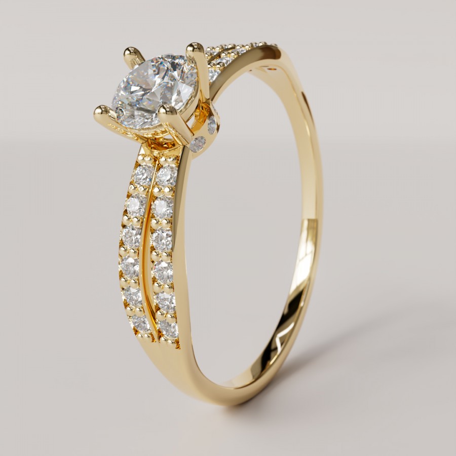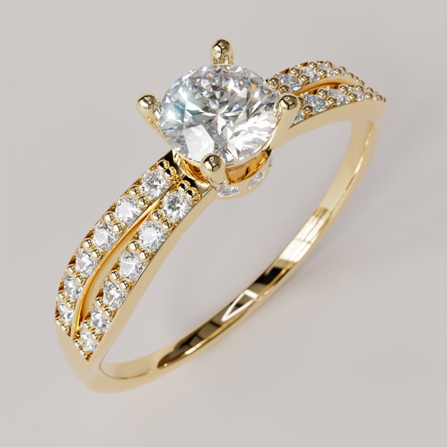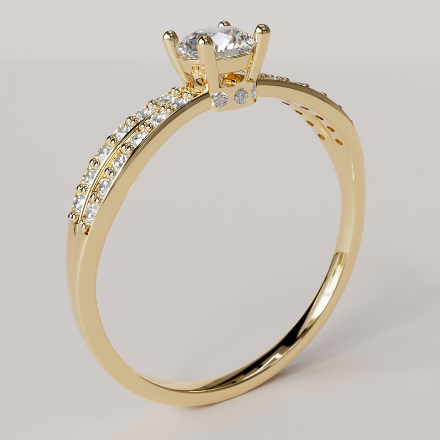 Nuestro anillo de compromiso Berreta, anillo de 1.4mm ancho en su parte inferior y 3.6mm en su parte superior, con una piedra central de 4mm y 24 piedras que la acompañan de 1.1mm, anillo elaborado en Oro de 18k con un peso aproximado de 1,9 gramos