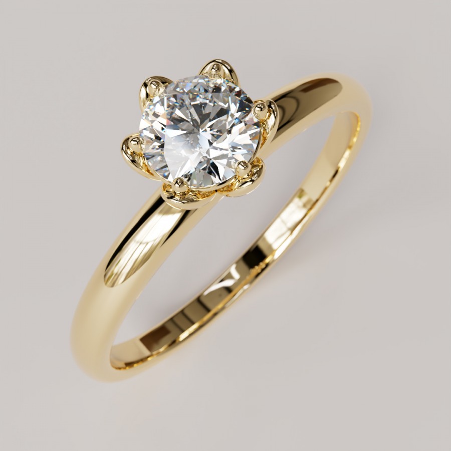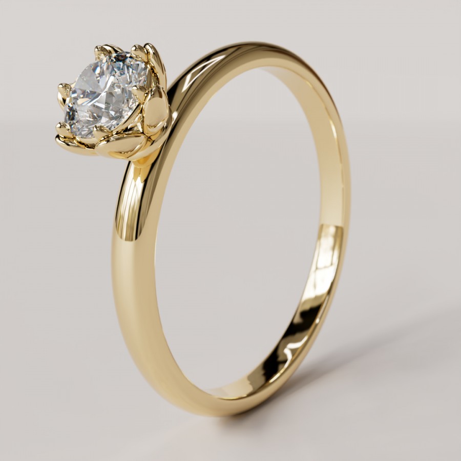 Nuestro anillo de compromiso Florentina de aspecto floral, anillo de 2mm ancho en su parte inferior con una piedra central de 4mm, anillo elaborado en Oro de 18k con un peso aproximado de 2,4 gramos
